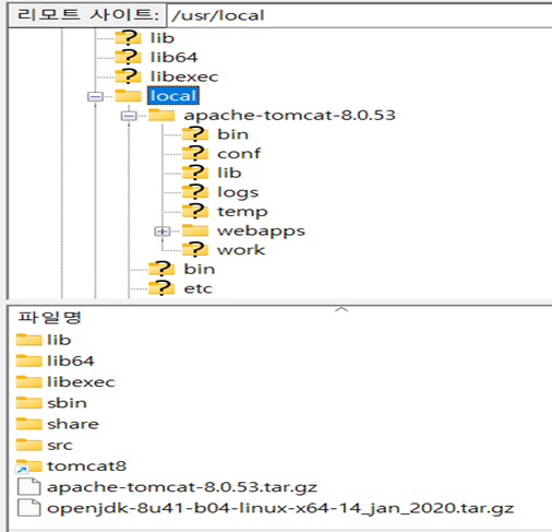 파일질라를 이용해 공유폴더의 /usr/local 폴더에 압축 파일들을 옮긴다.