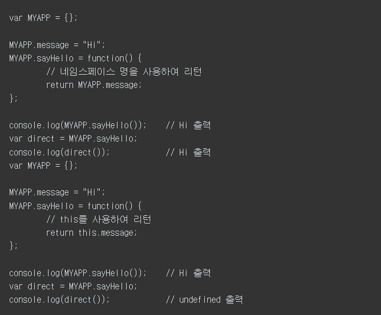 그래서 this는 절대 네임스페이스로 사용되고 있는 객체를 참조해서는 안된다.